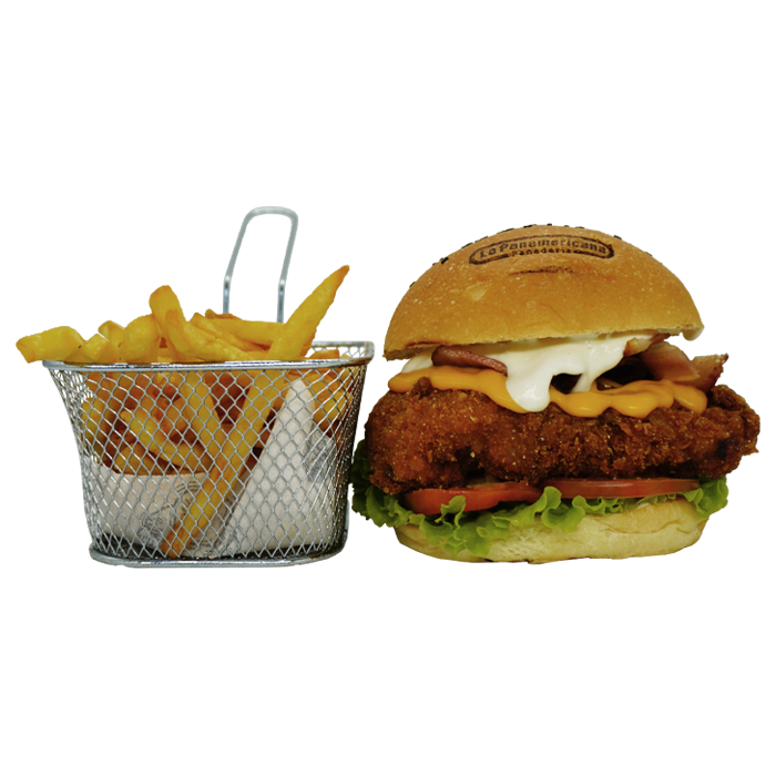 Nuestra Hamburguesa Casupo lleva pechuga de pollo crispy, tocineta ahumada, lechuga, tomate, cebolla caramelizada, queso fundido y aderezo Ranch, acompañada de papas fritas.