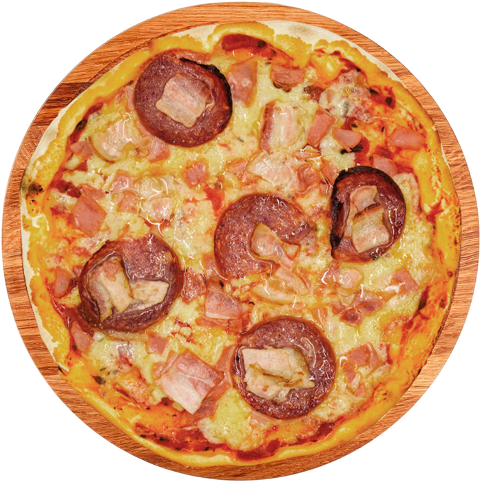 Deléitate con nuestra Pizza Especial, elaborada sobre una base de masa fresca y nuestra exquisita salsa para pizza. Cubierta generosamente con queso mozzarella, y una combinación irresistible de salchichón , jamón de pierna y crujiente tocineta ahumada . Perfecta para compartir y disfrutar de un sabor único.