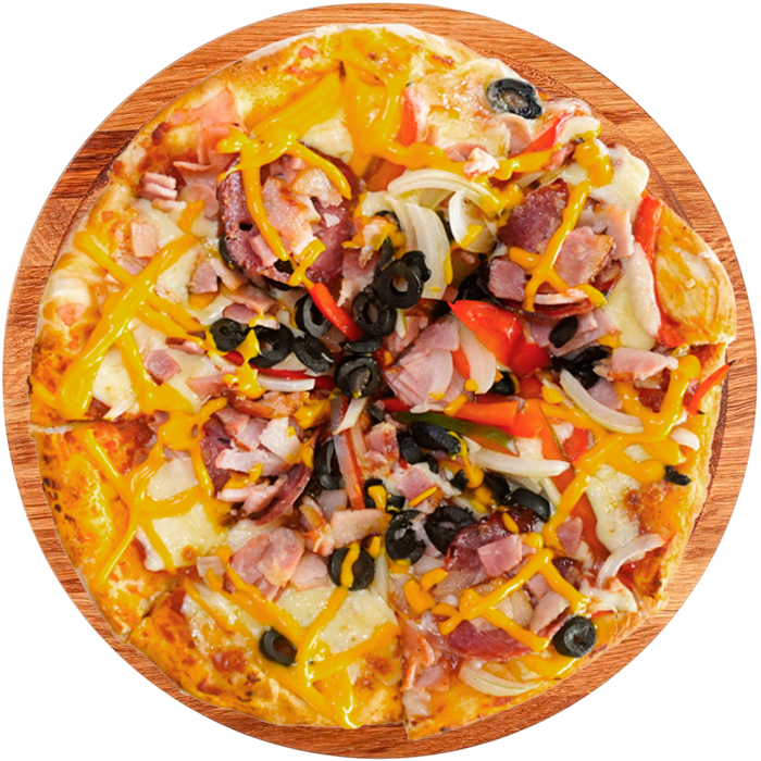 Disfruta de nuestra Pizza Rústica, una deliciosa combinación de sabores auténticos sobre una base de masa para pizza fresca. Cada porción está cargada con generosas capas de salchichón, jamón de pierna , crujiente tocineta ahumada , y un toque de cebolla blanca y pimentón fresco. Todo esto bañado en nuestra rica salsa para pizza, cubierto con abundante queso mozzarella y queso fundido, y finalizado con aceitunas negras. Una pizza llena de carácter y sabor tradicional.