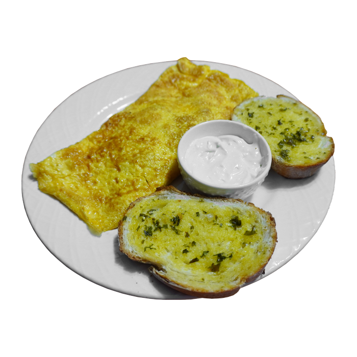 Preparado con huevos al momento, relleno con queso amarillo, jamón de pierna y crujiente tocineta. Servido con 2 rebanadas de pan al ajillo y natilla.